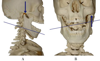 当院では、Dr.Caseyの理論の頚椎2番の横方向からのみの力学的問題に加えて、正面像での捻れ、傾きがさらに片側の顎関節ストレスを加える事を発見しました。